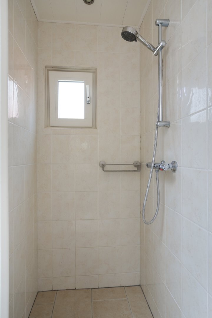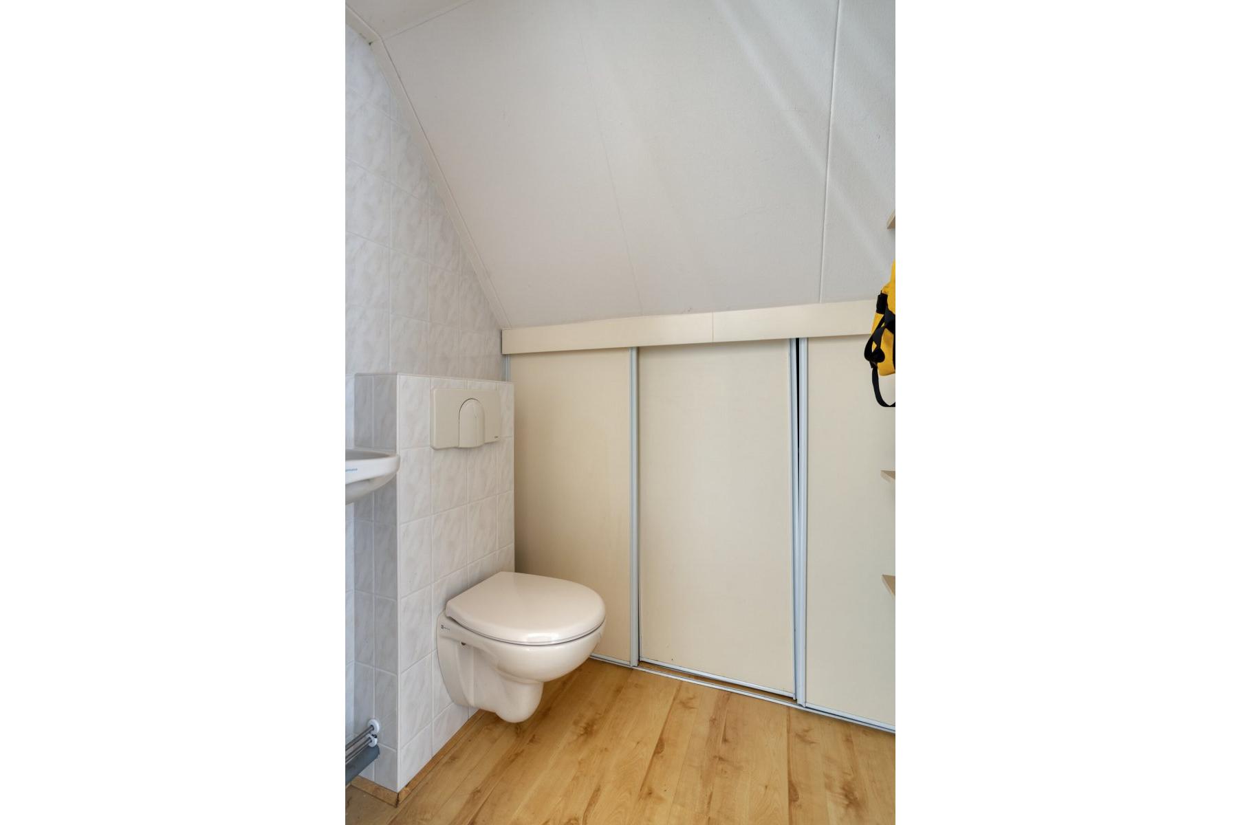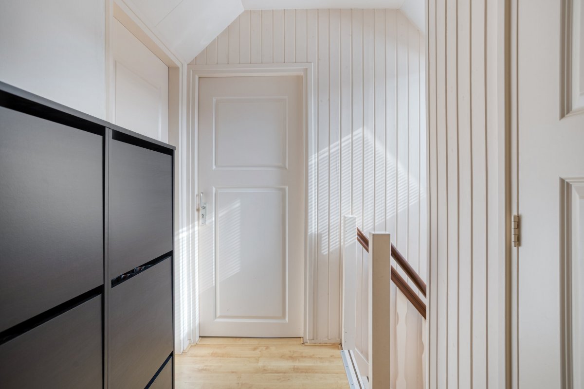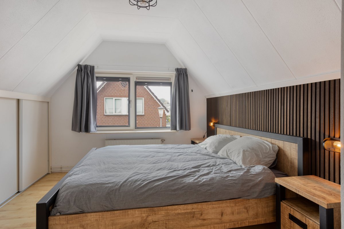 Verdieping: overloop met inloopkast, tweede hangend toilet met fonteintje, 3 slaapkamers (resp. ca. 8m² (met zgn. "hooizolder"), ca.10m² (met inbouwkast) en ca.12m² (voorzien van berging achter de knieschotten) alle met laminaatvloer.