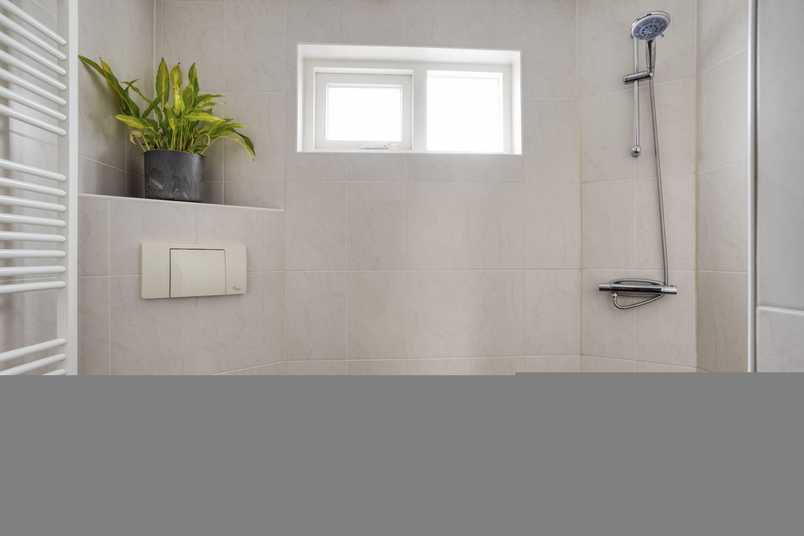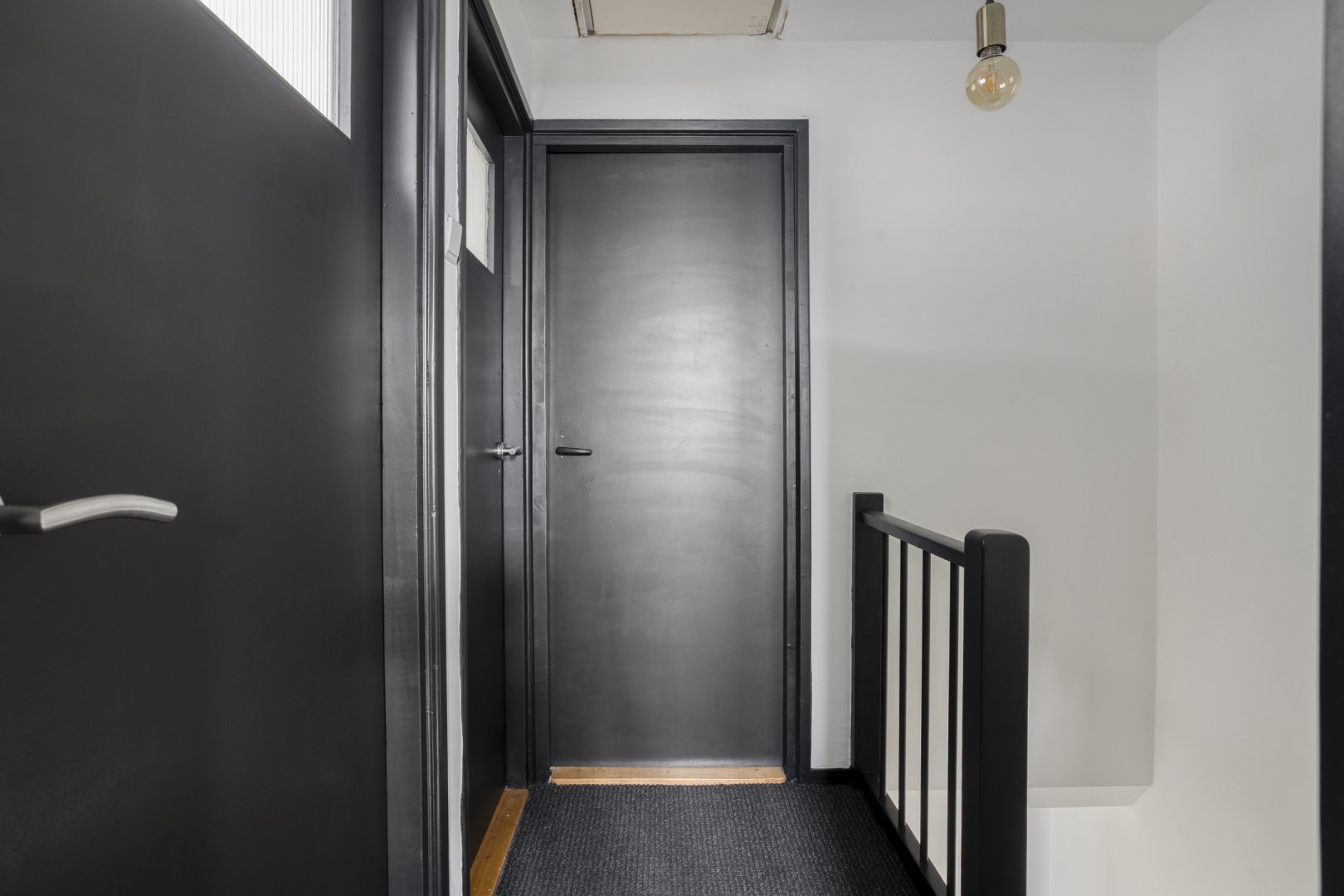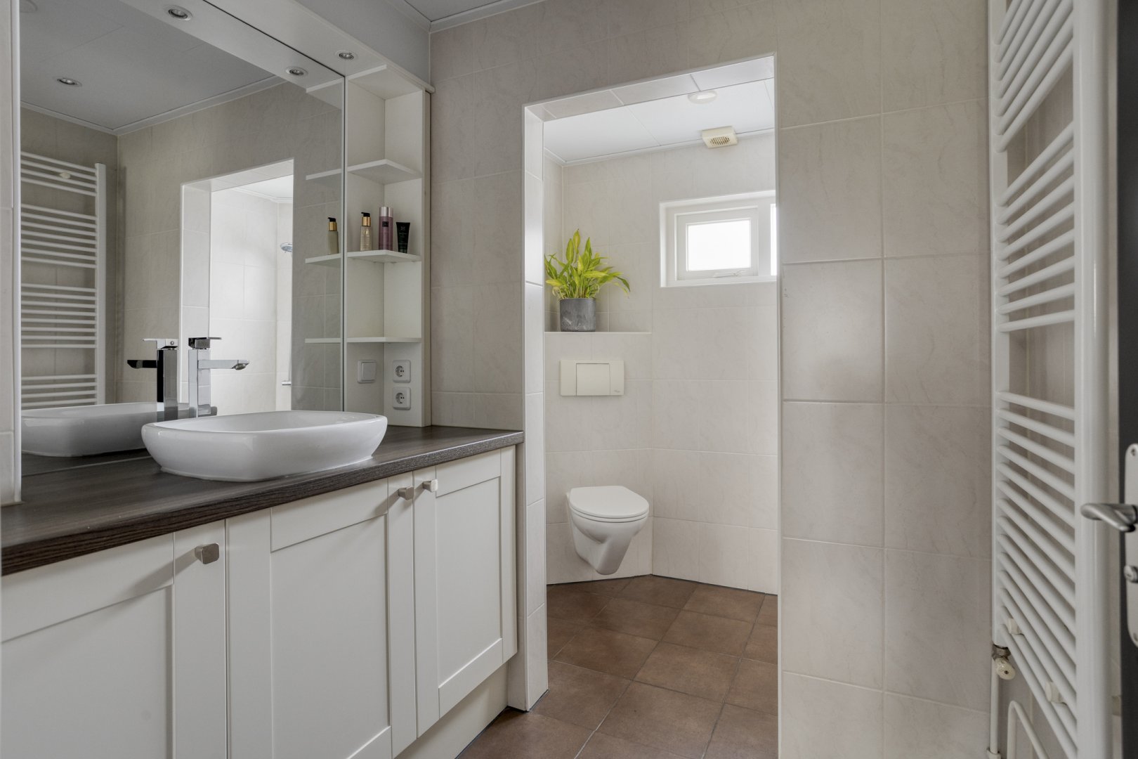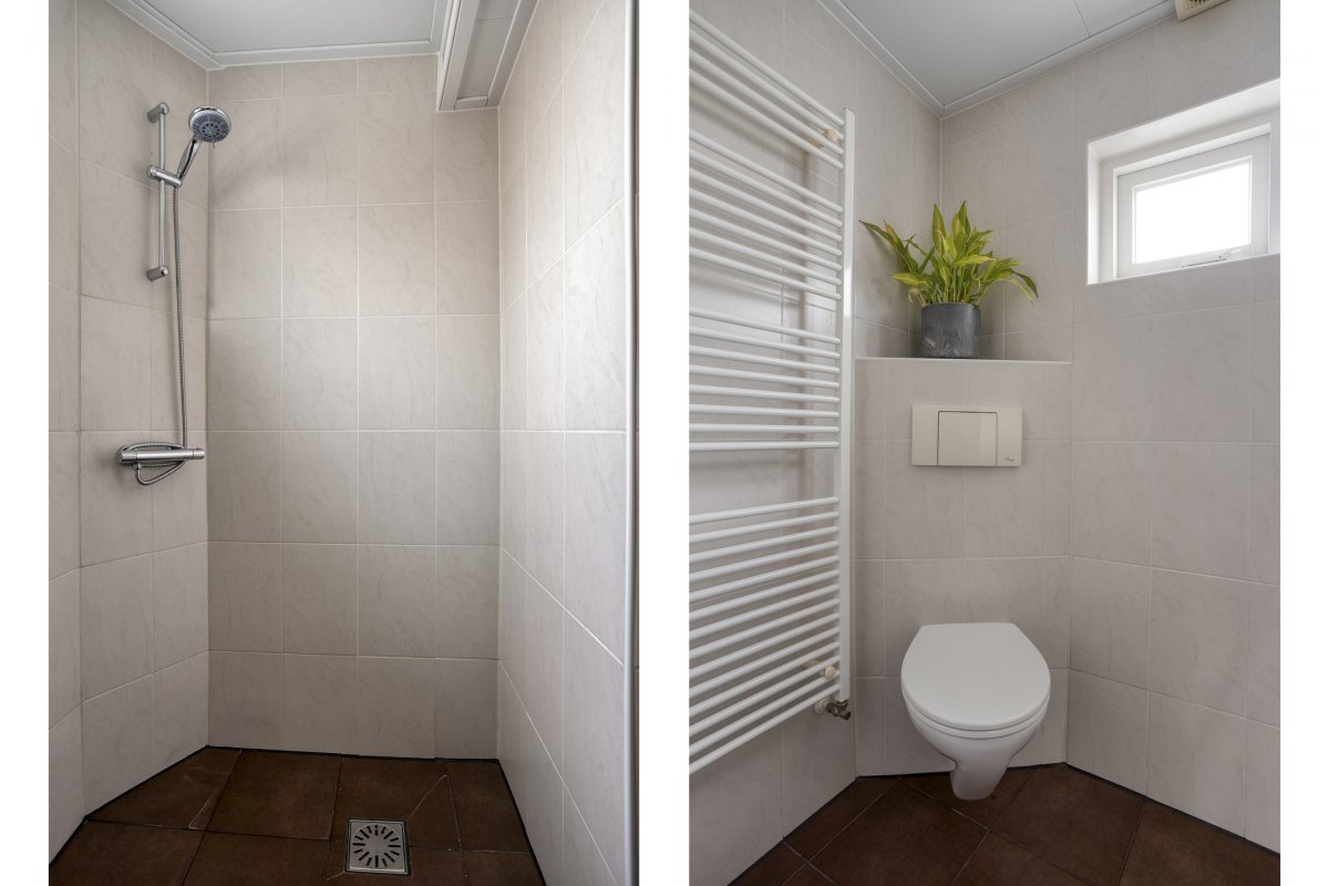 Eerste verdieping: overloop, drie slaapkamers resp. ca.3.15x3.00m, ca.3.75x2.60m en ca,2.65x2.10m, badkamer met inloopdouche, wastafelmeubel, hangend 2e toilet, twee designradiatoren en mechanische afzuiging.
