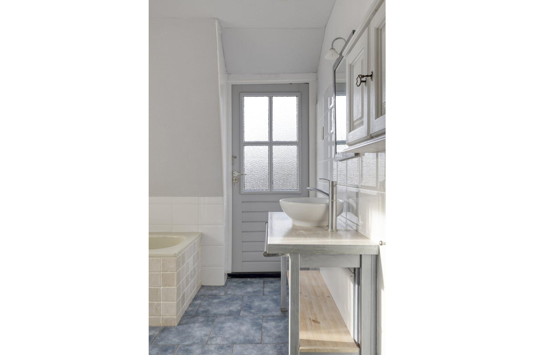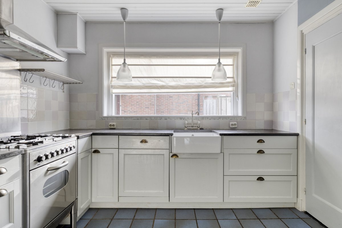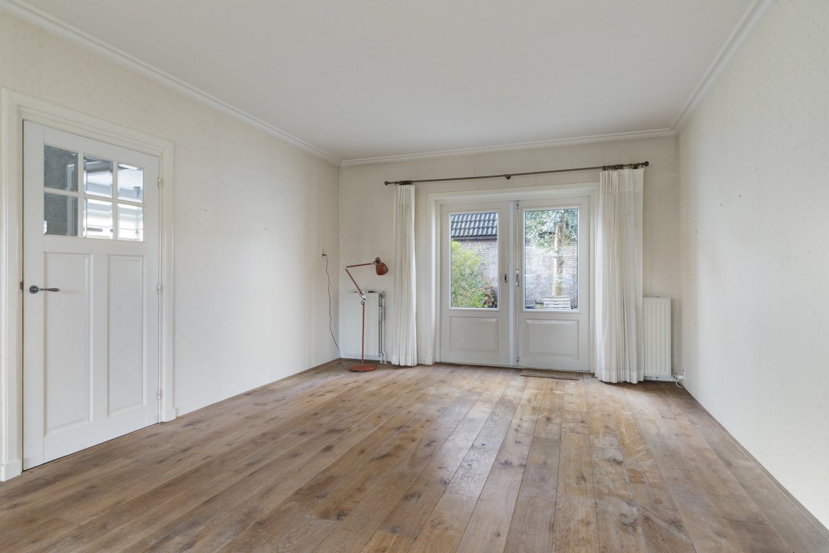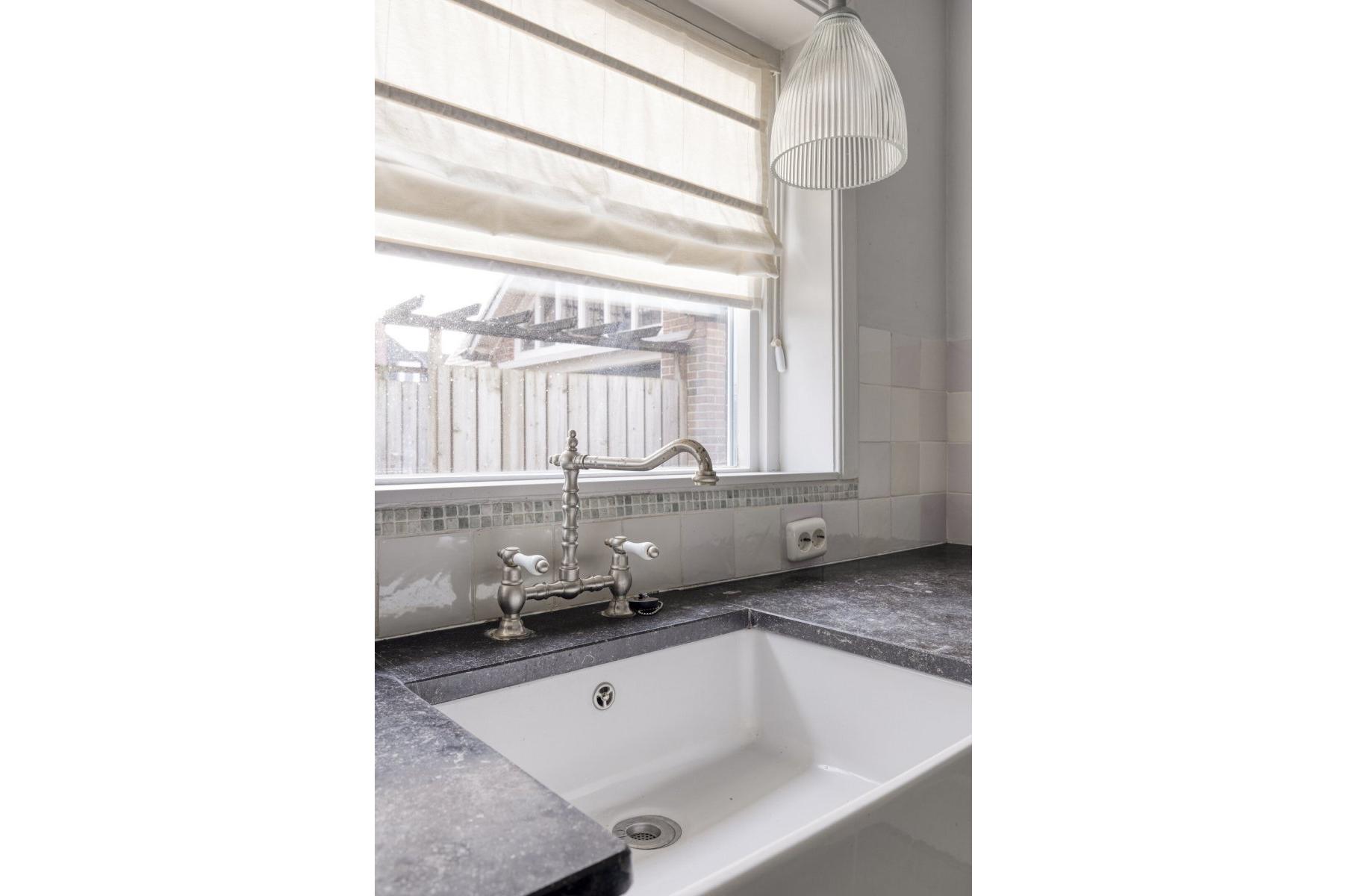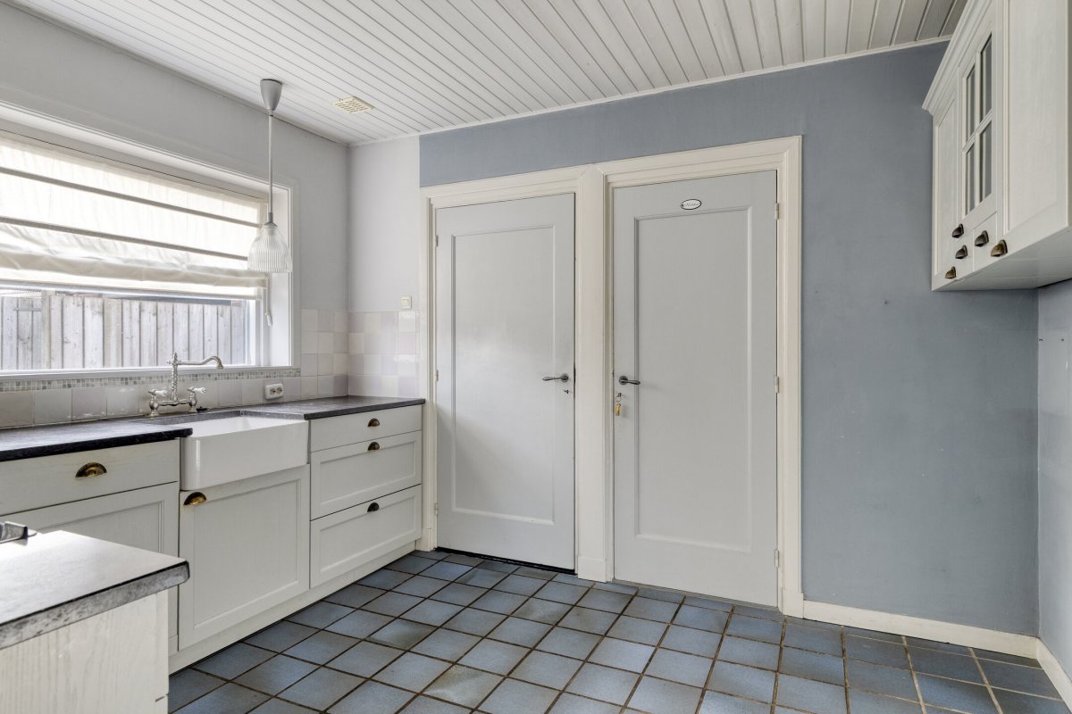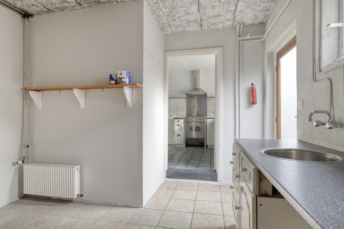 Begane grond: zijentree, ruime hal (plv.), hangend toilet met fontein, L-vormige woonkamer ca.44m² met haardpartij, eiken vloerdelen en openslaande deuren naar de achtertuin, woonkeuken ca.11m² (plv) in hoekopstelling en uitgerust met inbouwapparatuur onder andere vaatwasser, 5 pits gaskookplaat, afzuigkap en elektrische oven. Verder is de keuken voorzien van een hardstenene aanrechtblad. Via de keuken toegang tot provisiekelder (bijna stahoogte), ruime bijkeuken met witgoedaansluitingen en een keukenblok, binnendoor naar de berging en de garage.