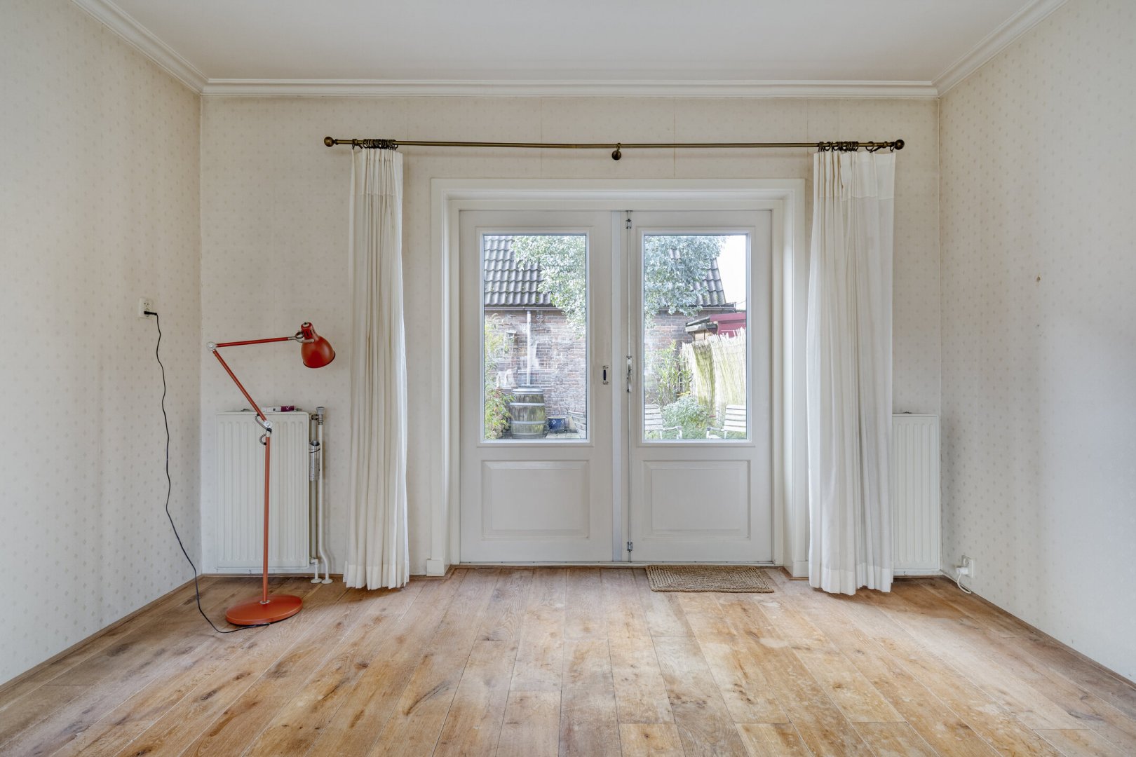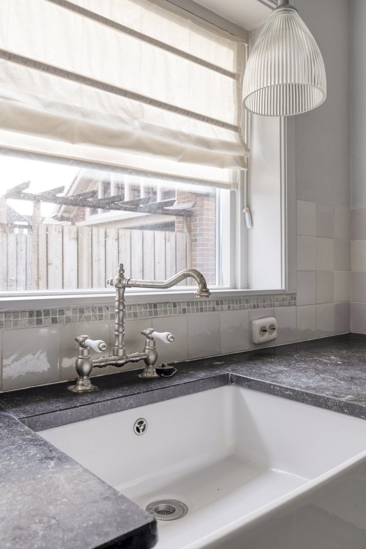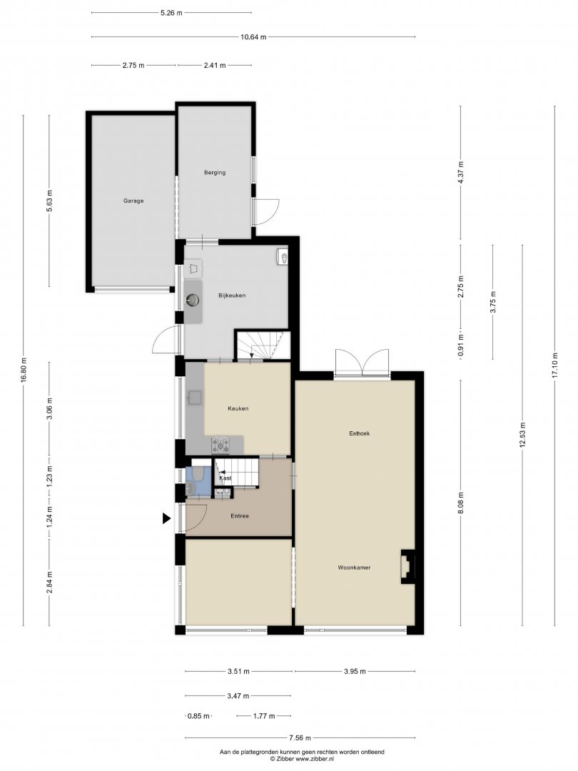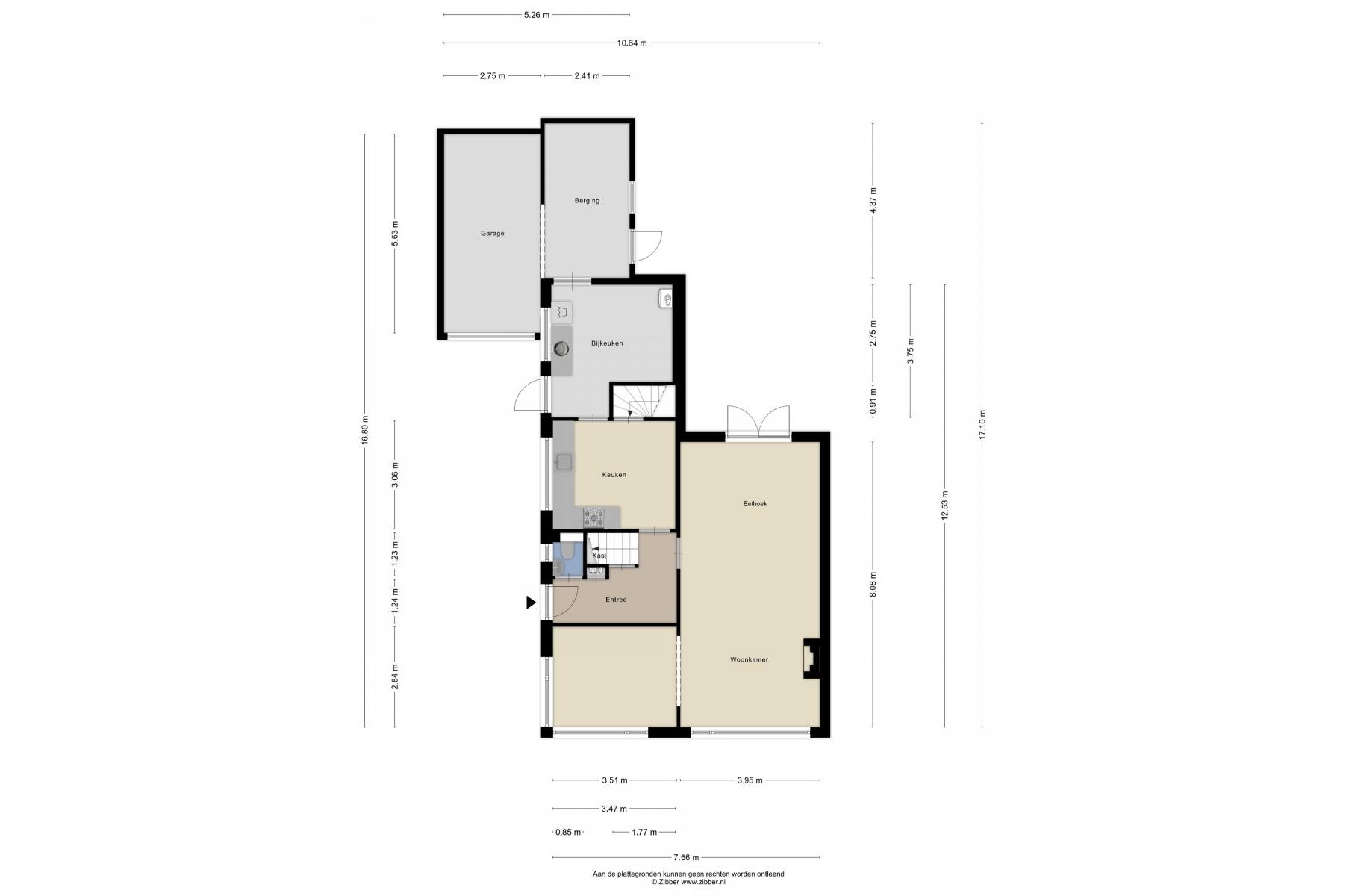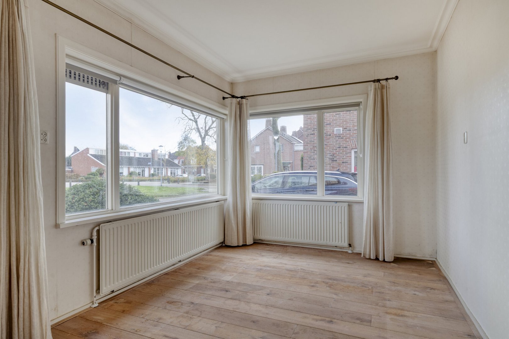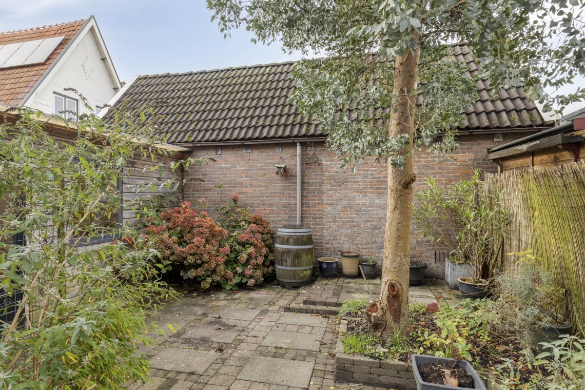 Begane grond: zijentree, ruime hal (plv.), hangend toilet met fontein, L-vormige woonkamer ca.44m² met haardpartij, eiken vloerdelen en openslaande deuren naar de achtertuin, woonkeuken ca.11m² (plv) in hoekopstelling en uitgerust met inbouwapparatuur onder andere vaatwasser, 5 pits gaskookplaat, afzuigkap en elektrische oven. Verder is de keuken voorzien van een hardstenene aanrechtblad. Via de keuken toegang tot provisiekelder (bijna stahoogte), ruime bijkeuken met witgoedaansluitingen en een keukenblok, binnendoor naar de berging en de garage.