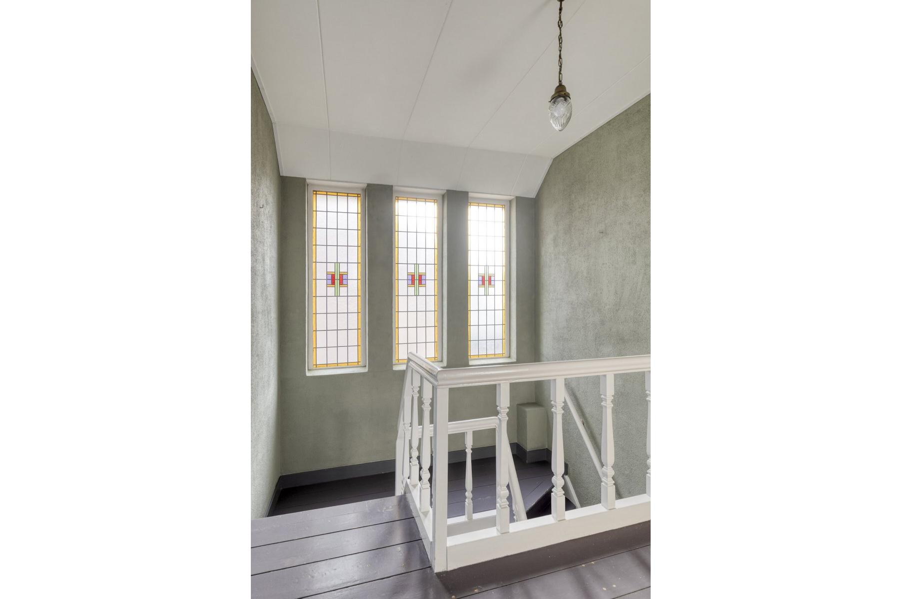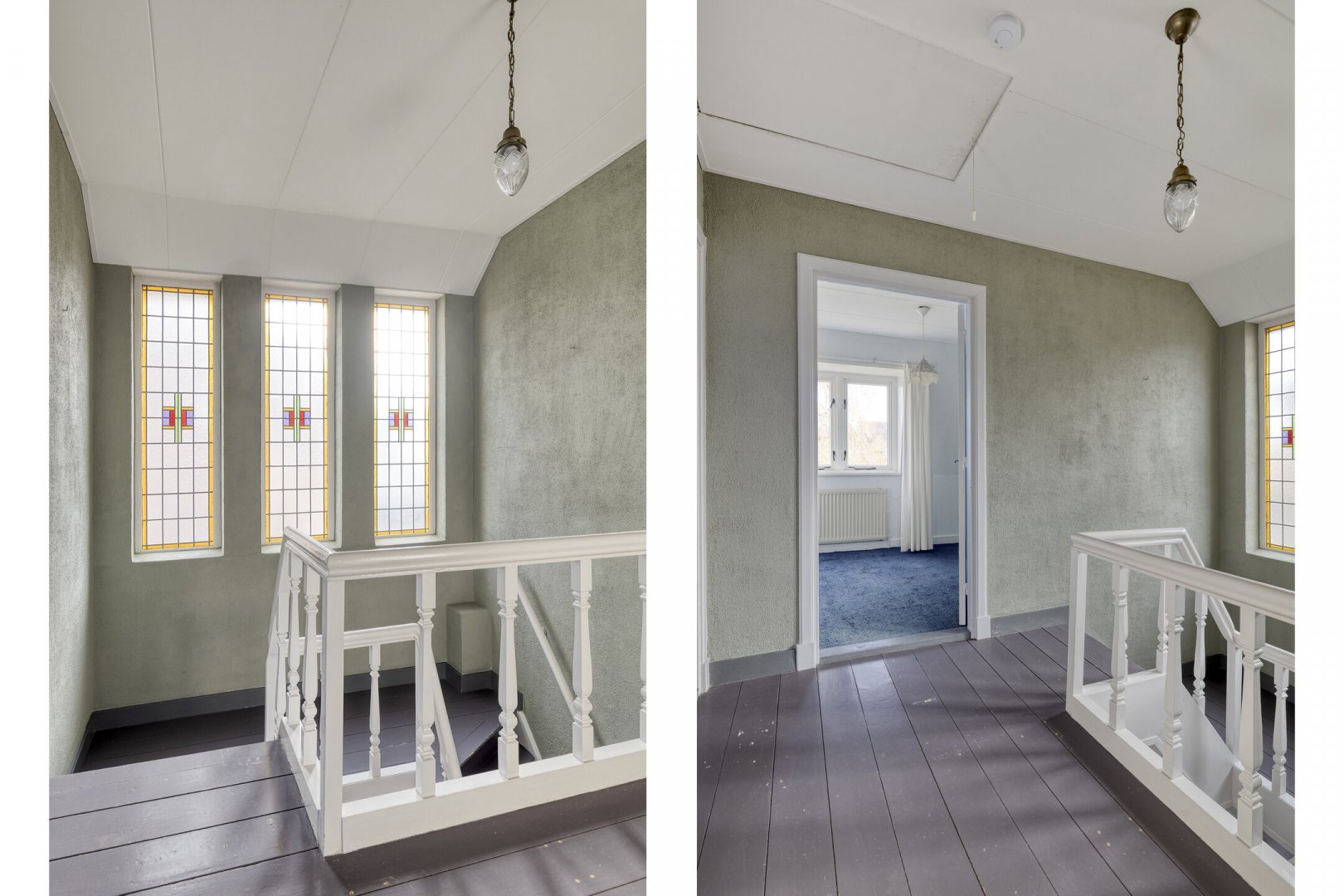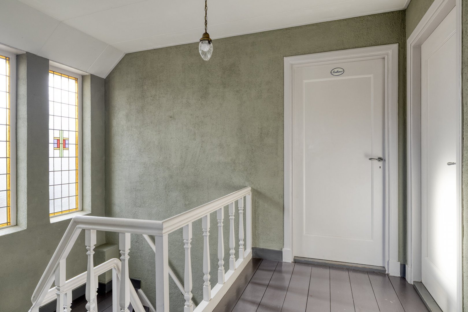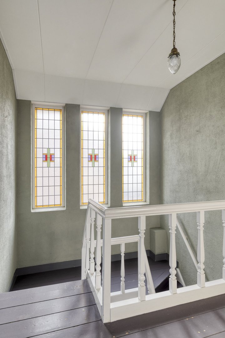 1e Verdieping: via bordestrap met prachtig glas-in-lood (met voorzetramen) naar de overloop, 3 comfortabele slaapkamers resp. ca.3.95x3.95m, ca.4.00x3.95m en ca.3.50x2.75 met vaste kasten, badkamer ca.9m² met inloopdouche, ligbad, wastafel en 2e hangend toilet.