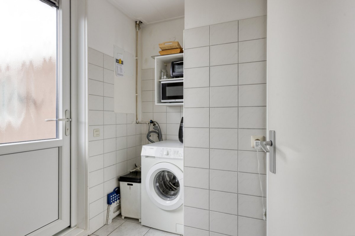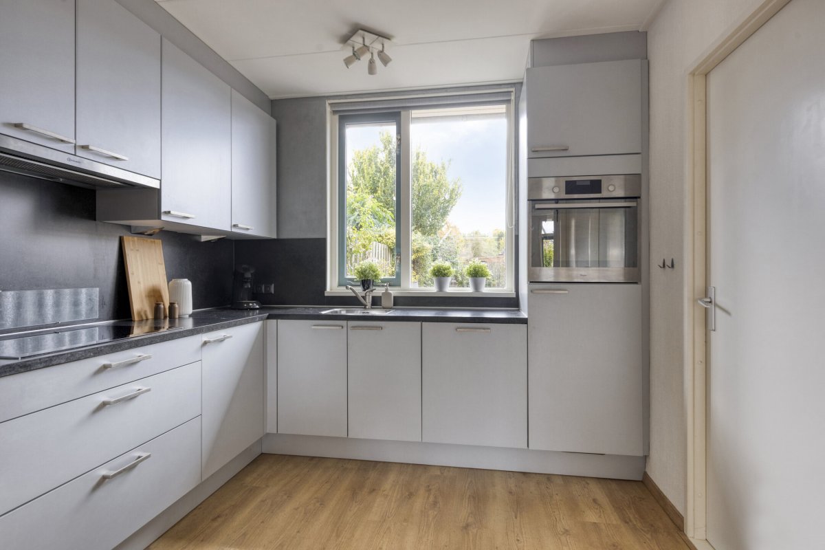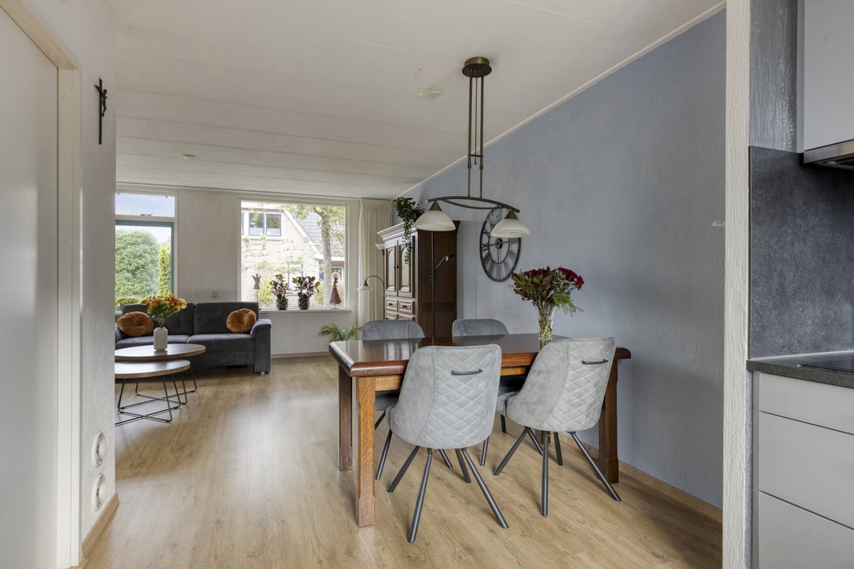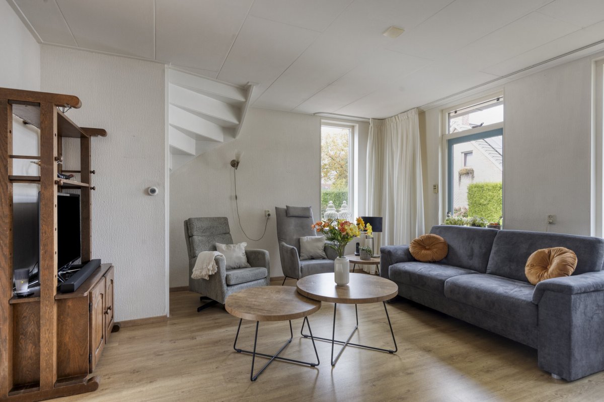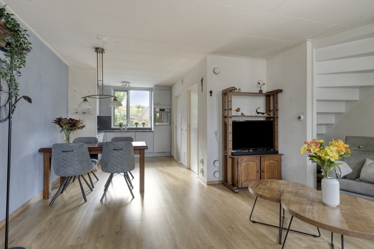 Begane grond: Zijenentree, toilet met fontein, L-vormige woonkamer ca.29m² met laminaatvloer, open keuken ca.6m² met hoekkeuken voorzien van inductie kookplaat, rvs afzuigkap, vaatwasser, oven en koelkast (2025), L-vormige bijkeuken met witgoed aansluiting en achterdeur naar de tuin.