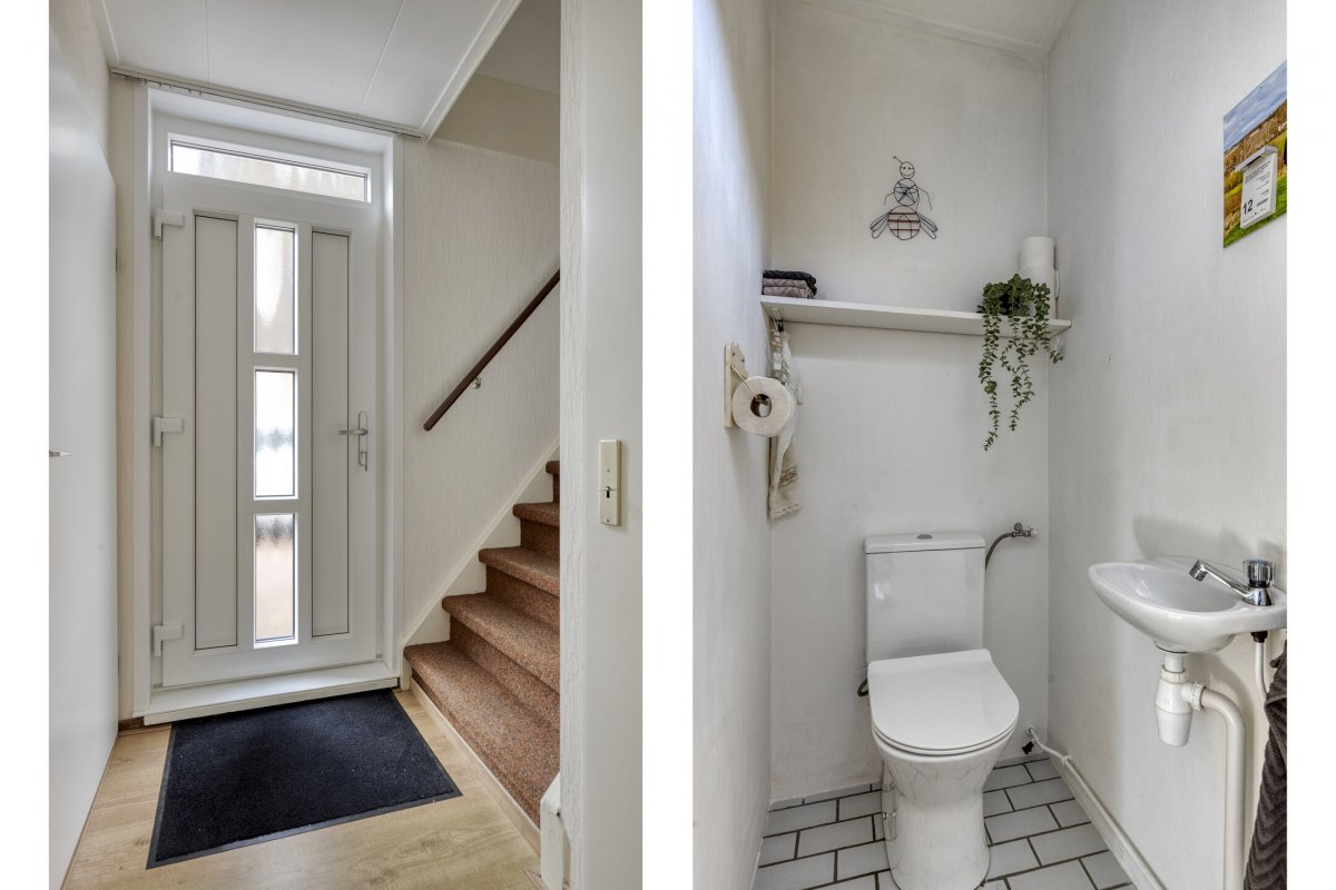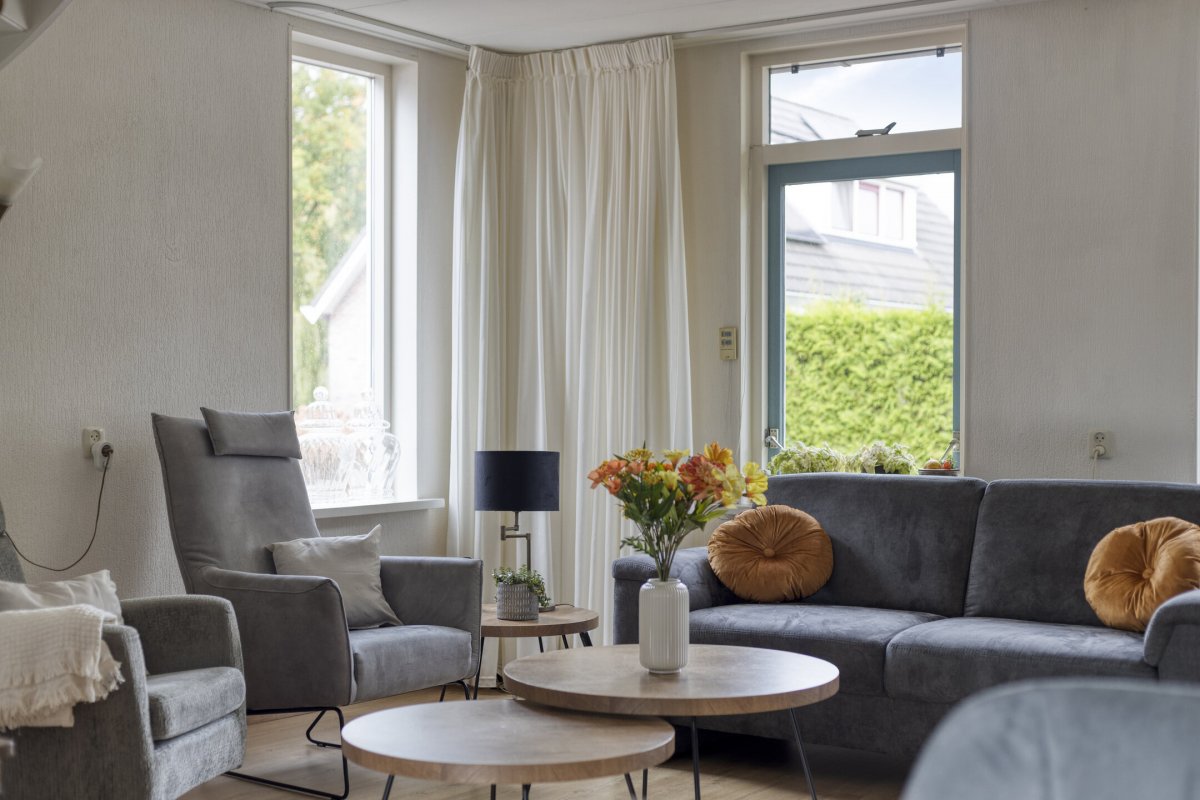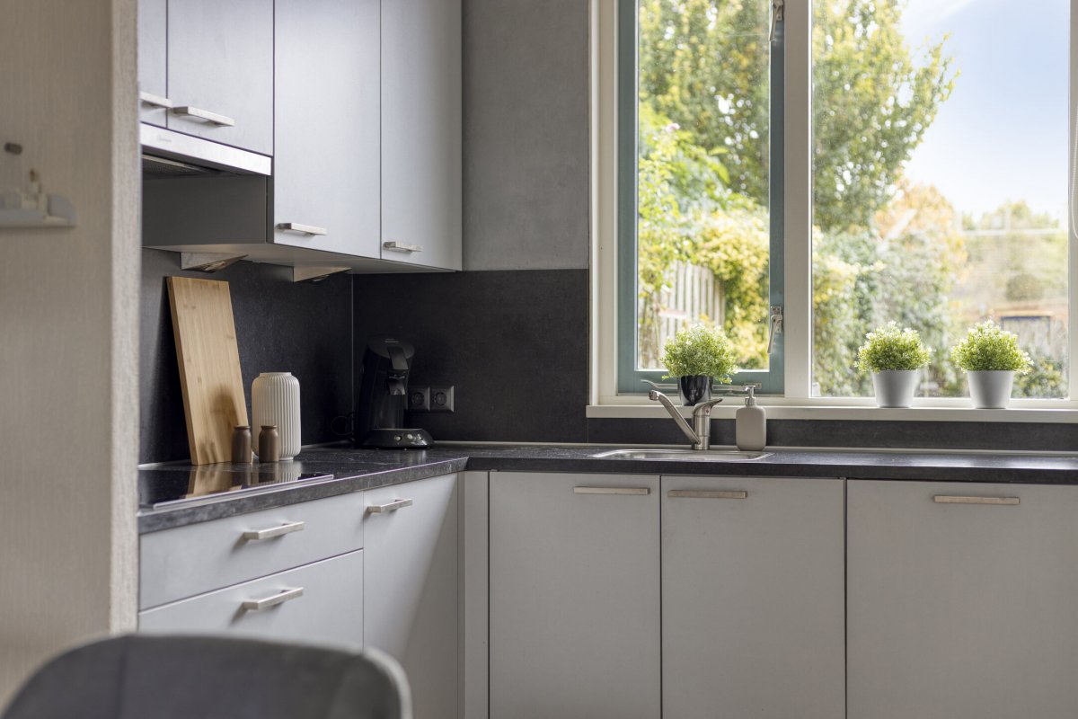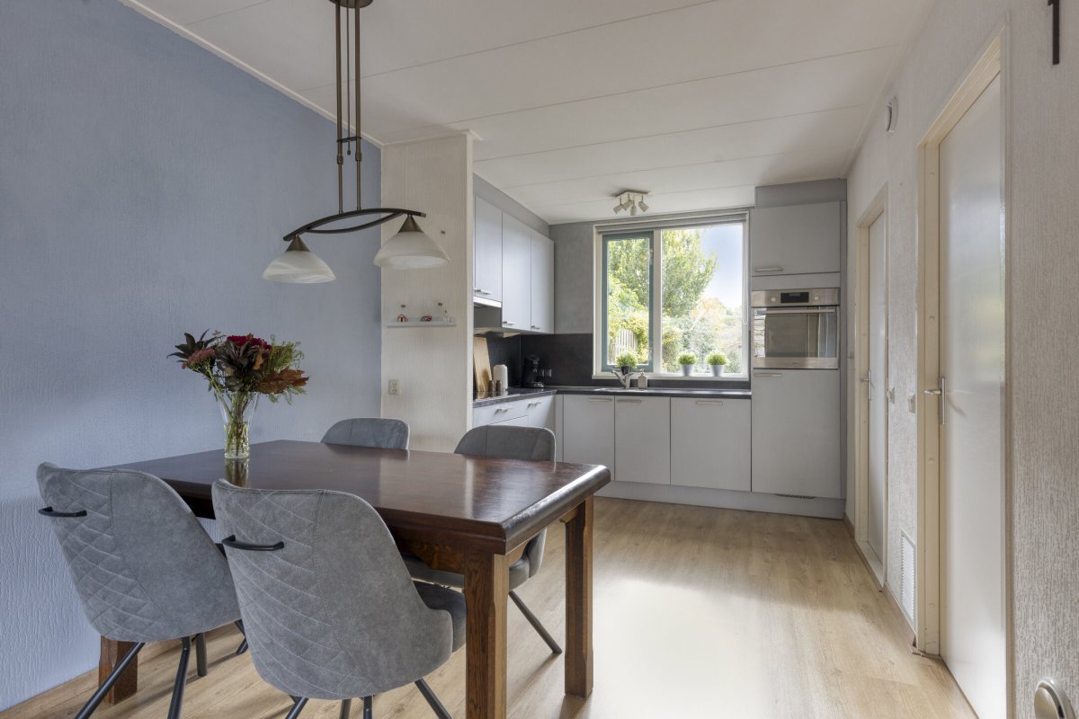 Begane grond: Zijenentree, toilet met fontein, L-vormige woonkamer ca.29m² met laminaatvloer, open keuken ca.6m² met hoekkeuken voorzien van inductie kookplaat, rvs afzuigkap, vaatwasser, oven en koelkast (2025), L-vormige bijkeuken met witgoed aansluiting en achterdeur naar de tuin.