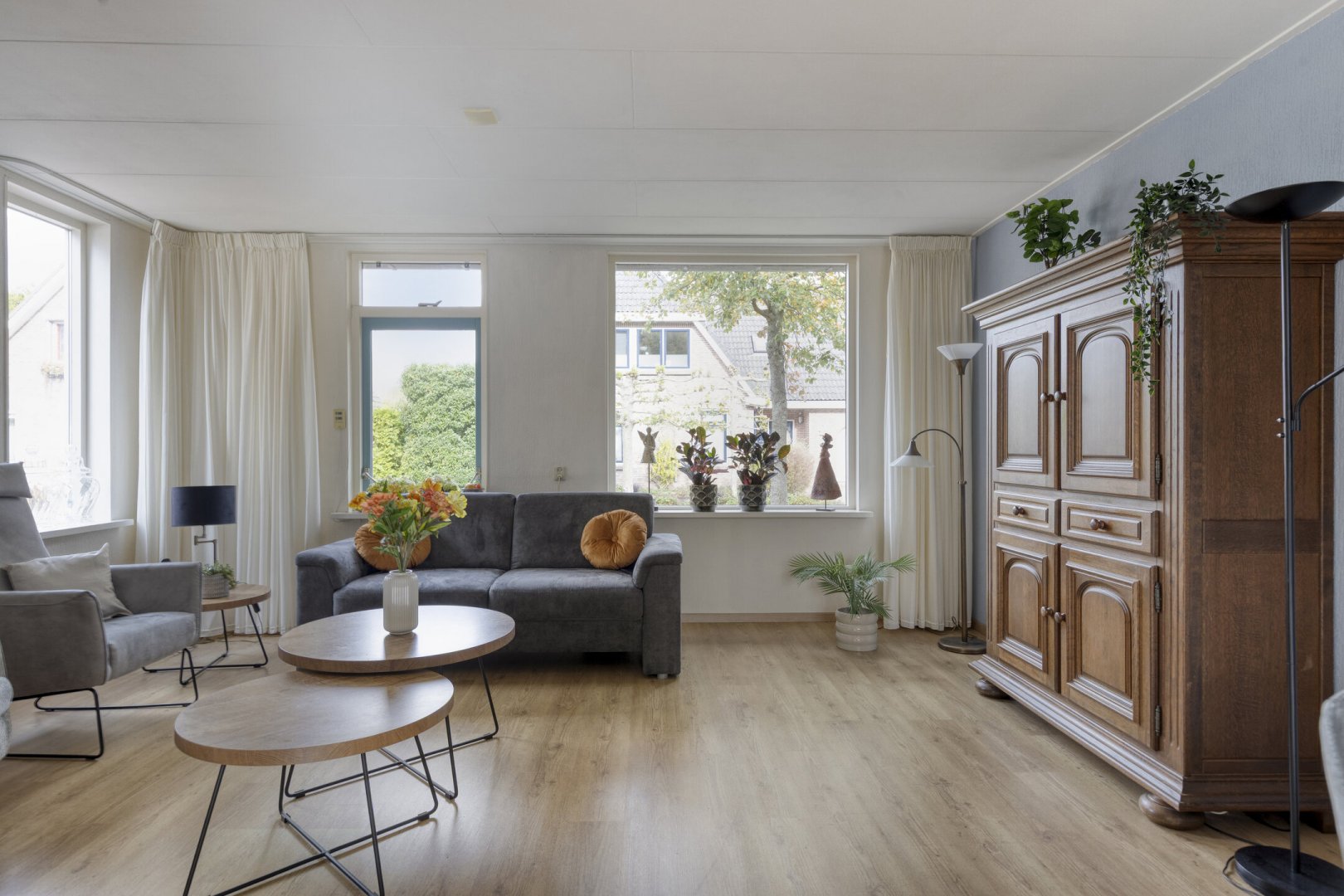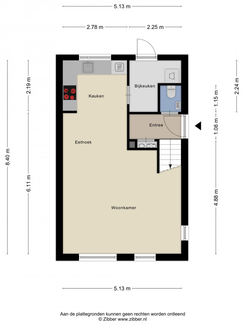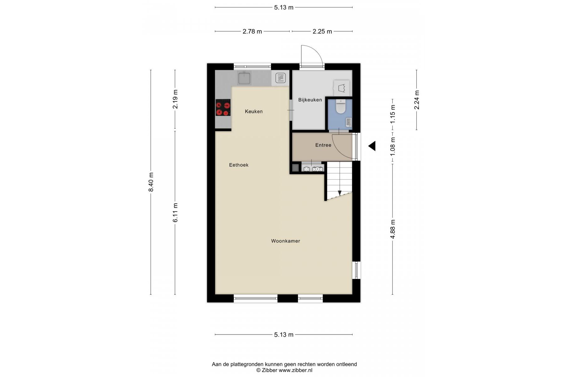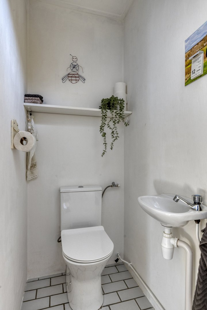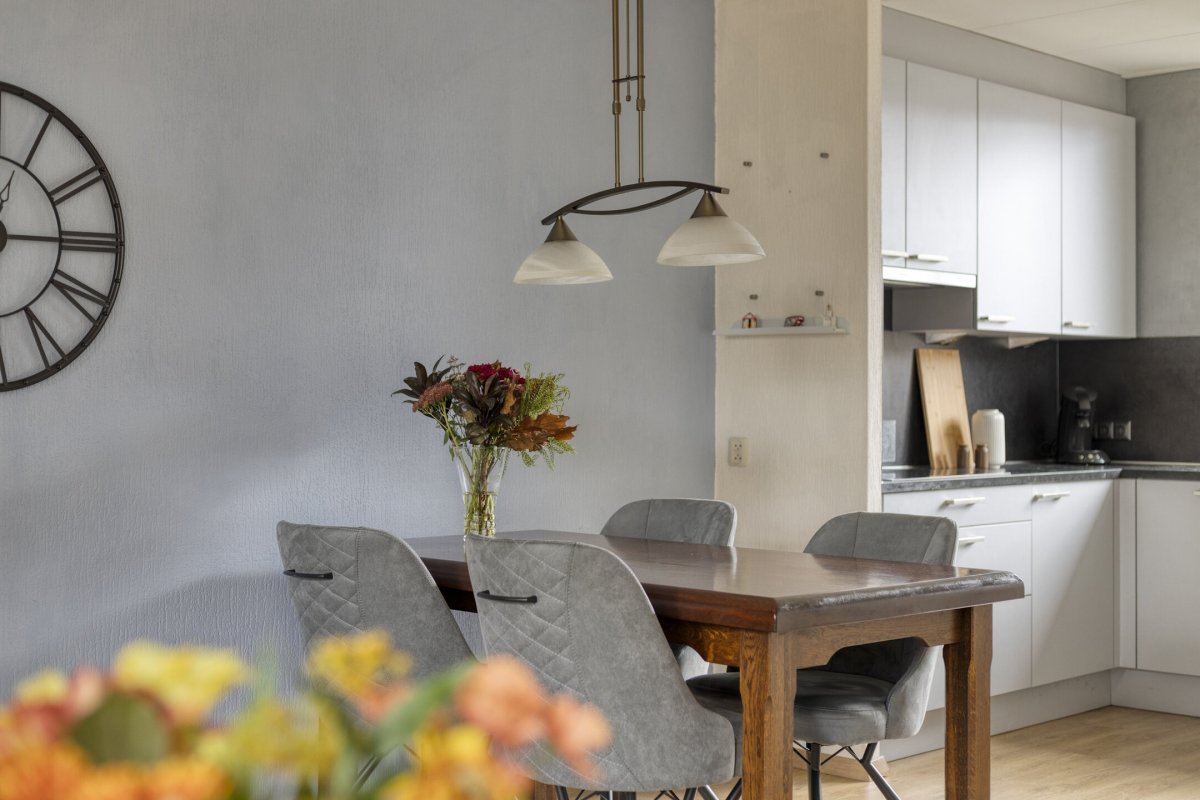 Begane grond: Zijenentree, toilet met fontein, L-vormige woonkamer ca.29m² met laminaatvloer, open keuken ca.6m² met hoekkeuken voorzien van inductie kookplaat, rvs afzuigkap, vaatwasser, oven en koelkast (2025), L-vormige bijkeuken met witgoed aansluiting en achterdeur naar de tuin.