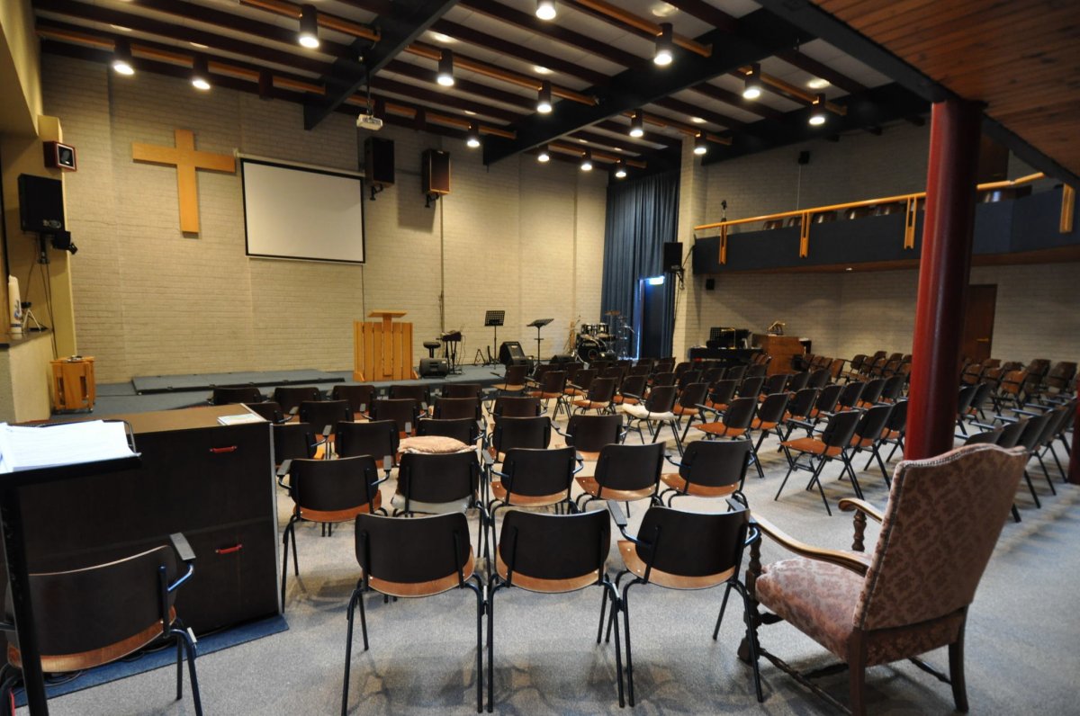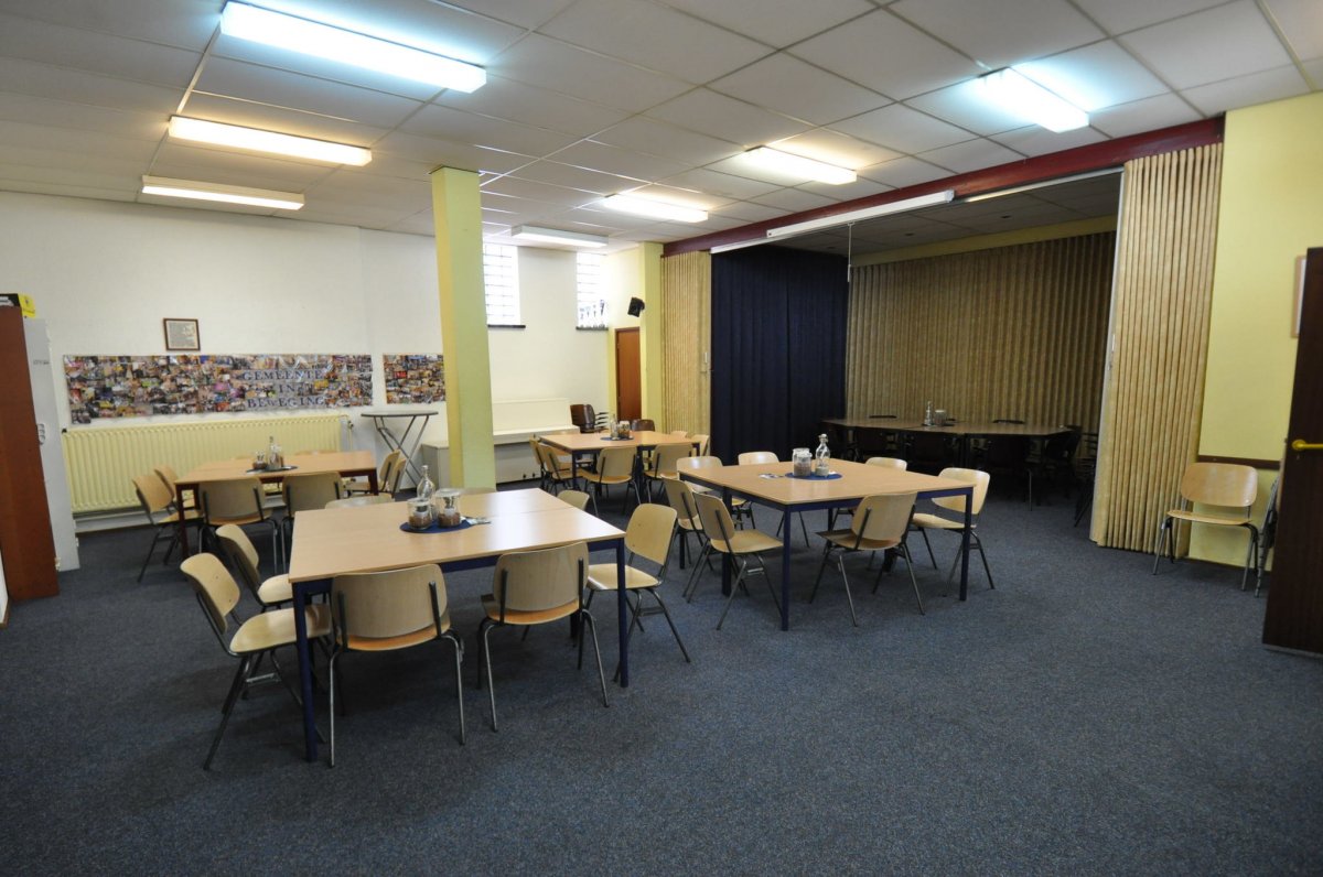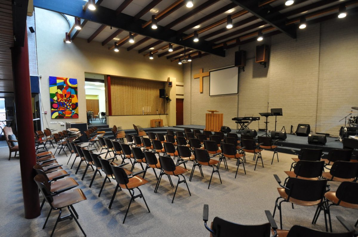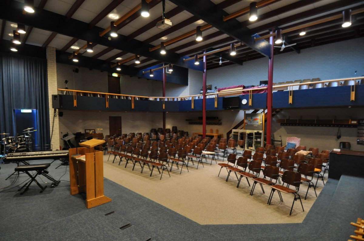 Begane grond: zijentree, hal, toiletgroepen dames en heren, ketelhuis, keuken met keukenblok, zaal voorzijde ca.49m², koffiezaal ca.91m², kerkzaal ca.172m² (vloerverwarming, woongrind) met bordes, lichtstraat en bergingen.