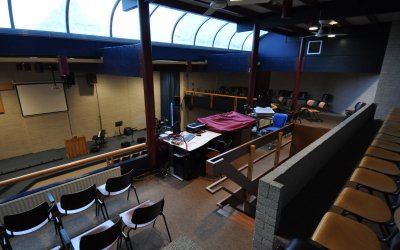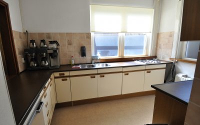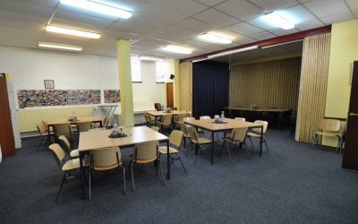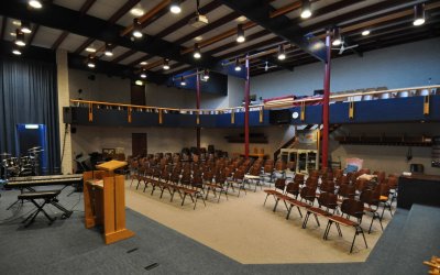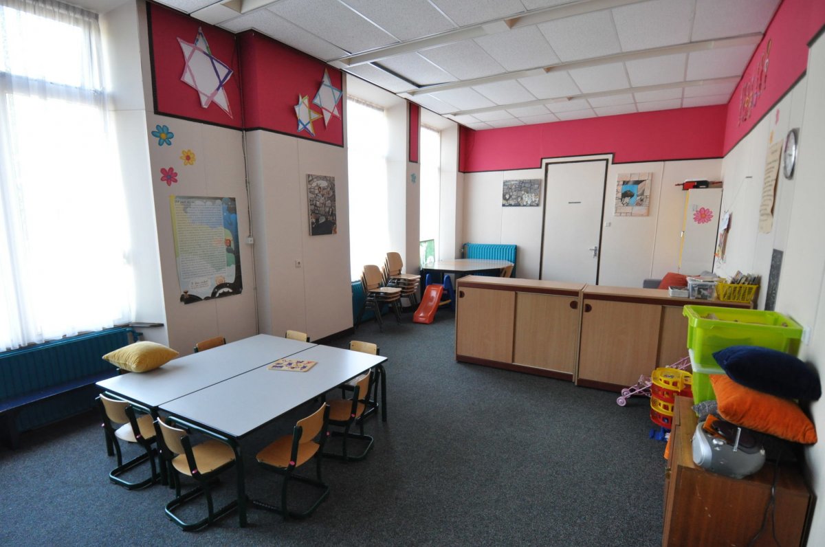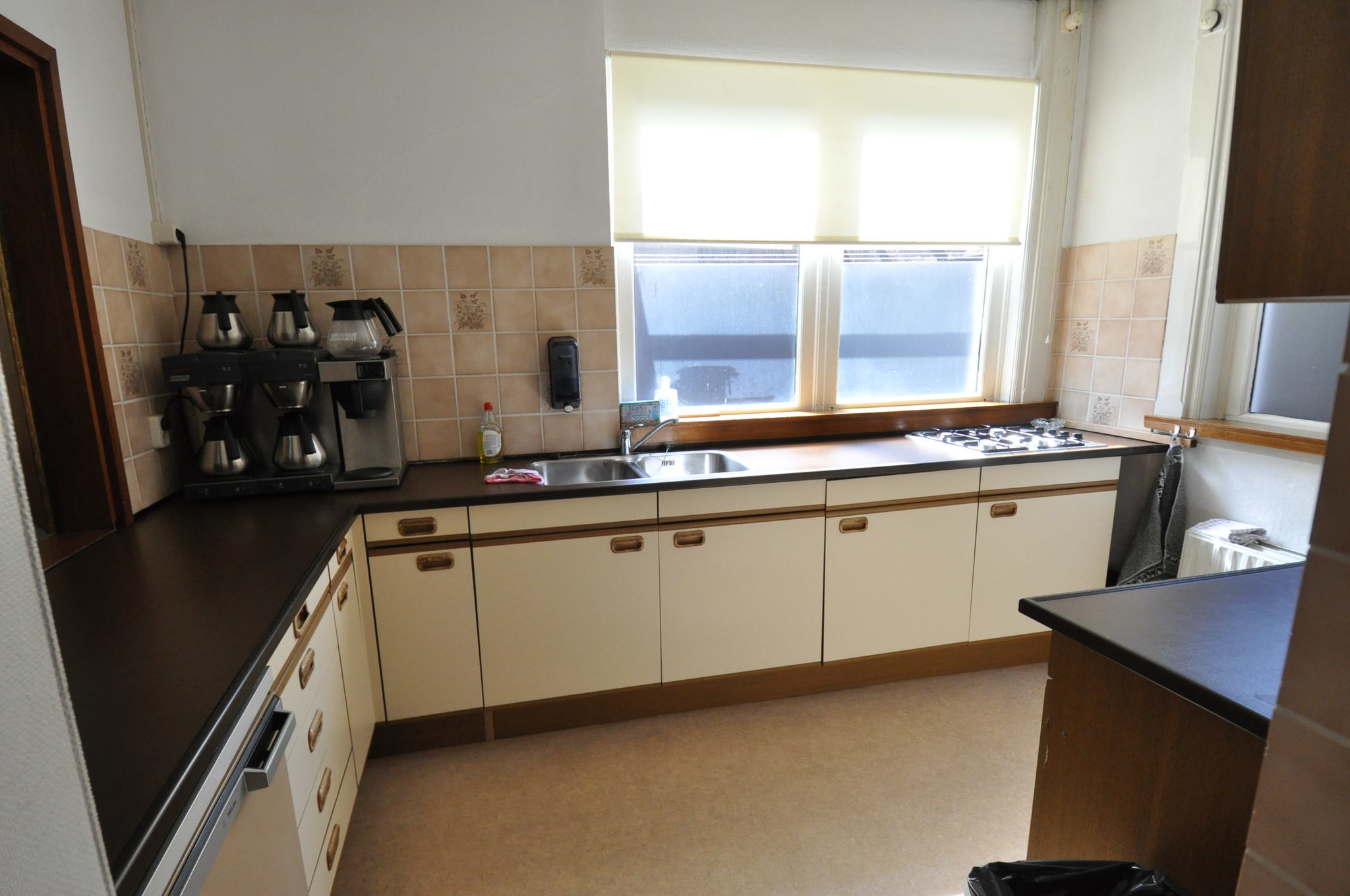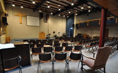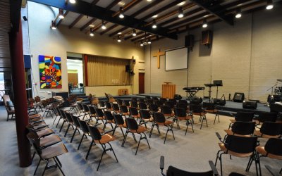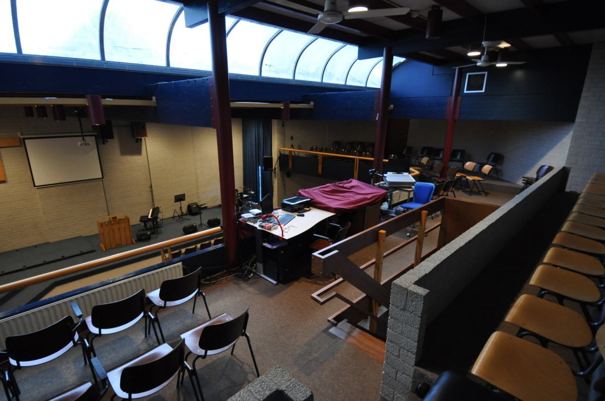 Begane grond: zijentree, hal, toiletgroepen dames en heren, ketelhuis, keuken met keukenblok, zaal voorzijde ca.49m², koffiezaal ca.91m², kerkzaal ca.172m² (vloerverwarming, woongrind) met bordes, lichtstraat en bergingen.